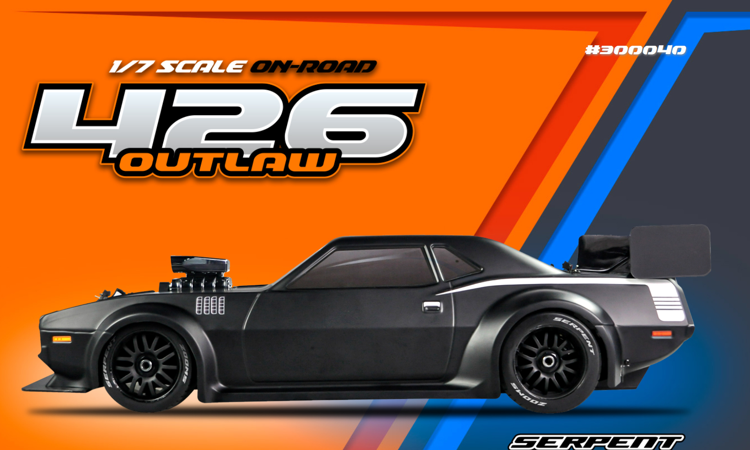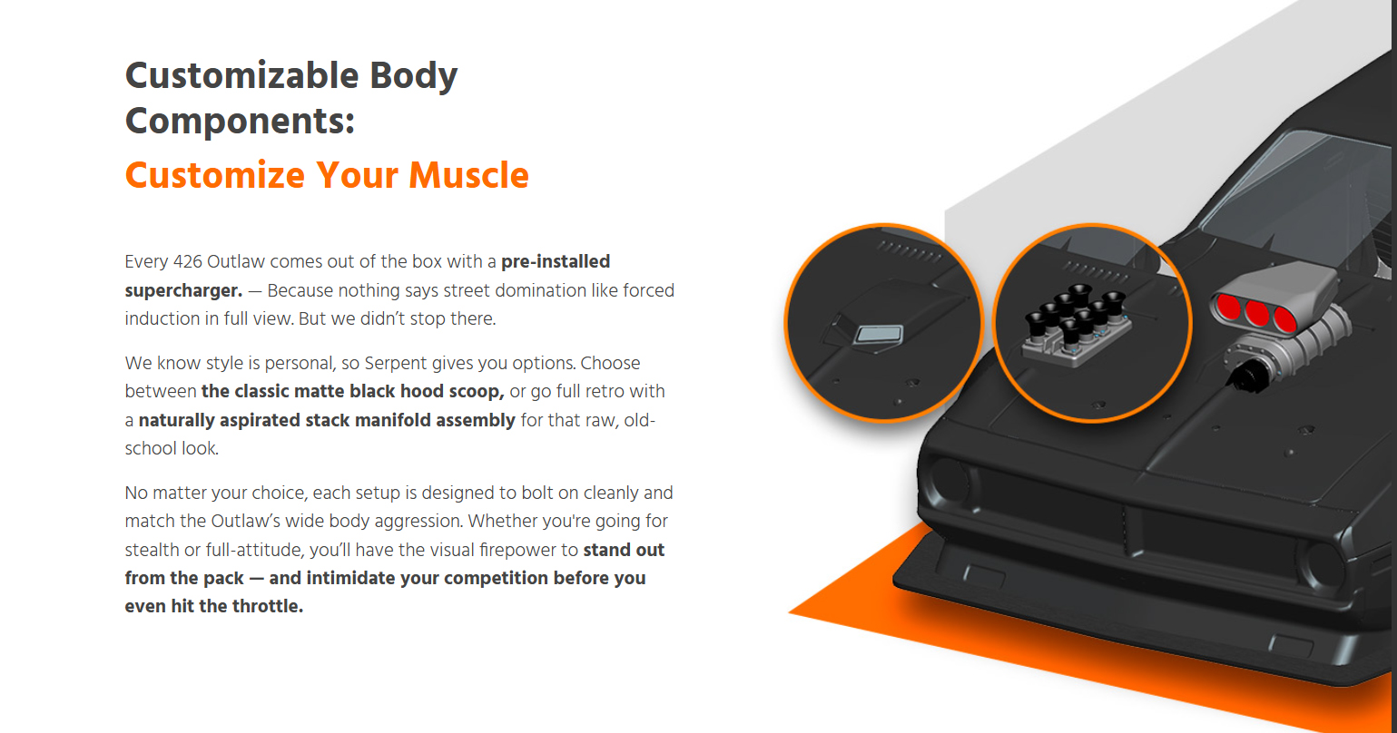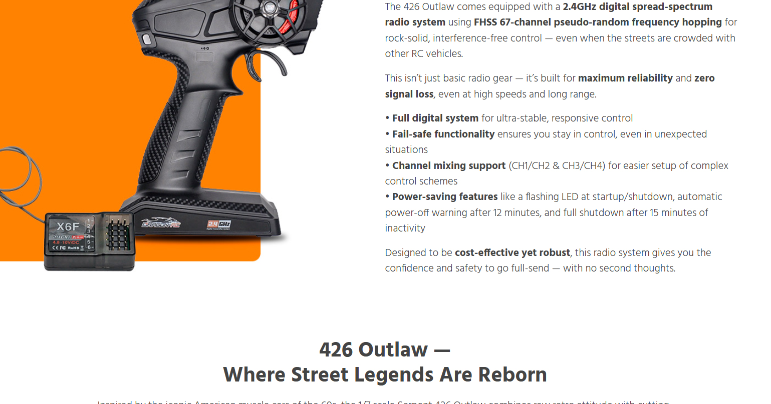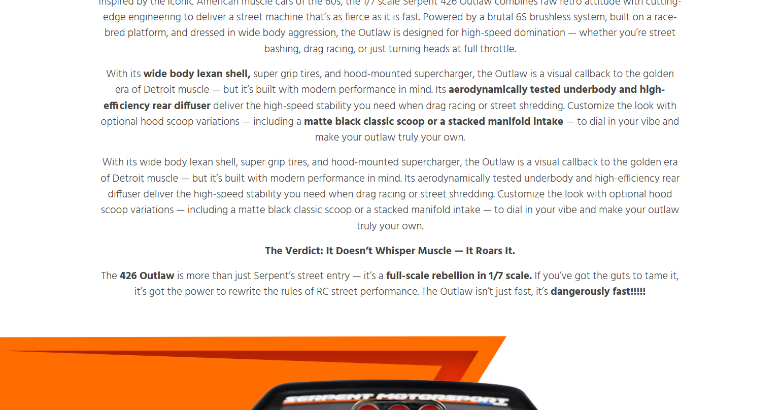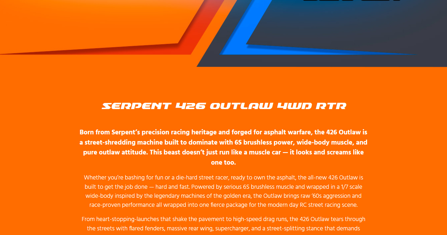 Born from Serpent’s precision racing heritage and forged for asphalt warfare, the 426 Outlaw is a street-shredding machine built to dominate with 6S brushless power, wide-body muscle, and pure outlaw attitude. This beast doesn’t just run like a muscle car — it looks and screams like one too. Whether you’re bashing for fun or a die-hard street racer, ready to own the asphalt, the all-new 426 Outlaw is built to get the job done — hard and fast. Powered by serious 6S brushless muscle and wrapped in a 1/7 scale wide-body inspired by the legendary machines of the golden era, the Outlaw brings raw ’60s aggression and race-proven performance all wrapped into one fierce package for the modern day RC street racing scene. From heart-stopping-launches that shake the pavement to high-speed drag runs, the 426 Outlaw tears through the streets with flared fenders, massive rear wing, supercharger, and a street-splitting stance that demands respect. Whether you’re tearing up your local parking lot or pushing the limits in a street race, this machine is your ticket to total domination. With Serpent’s racing heritage under the hood and outlaw attitude on every corner, the 426 Outlaw isn’t just another RC car — it’s a full-scale rebellion that challenges the status quo and leaves competitors in the dust. When the streets demand a rebel, the 426 Outlaw answers the call: no rules, no mercy.