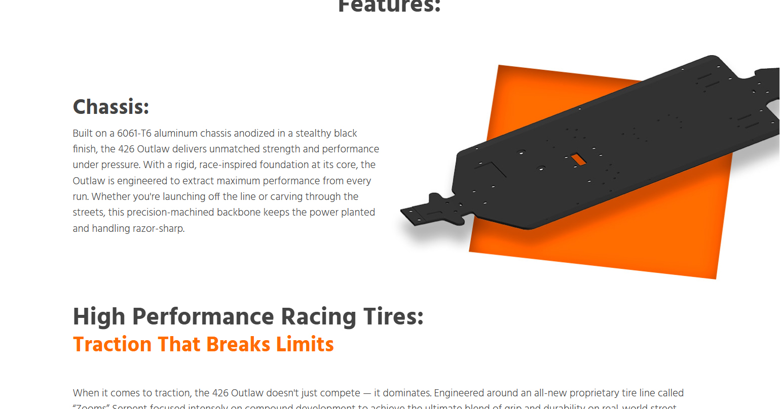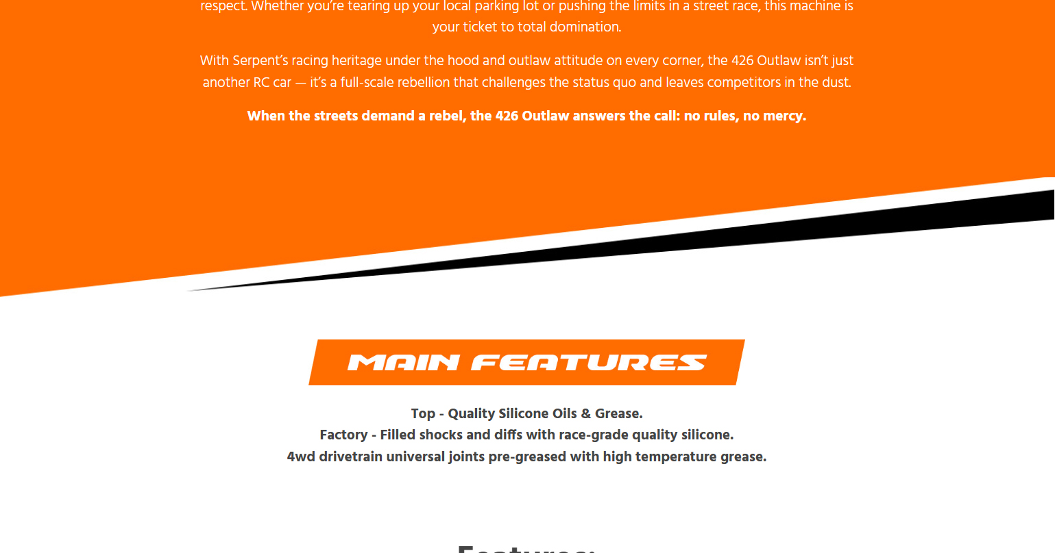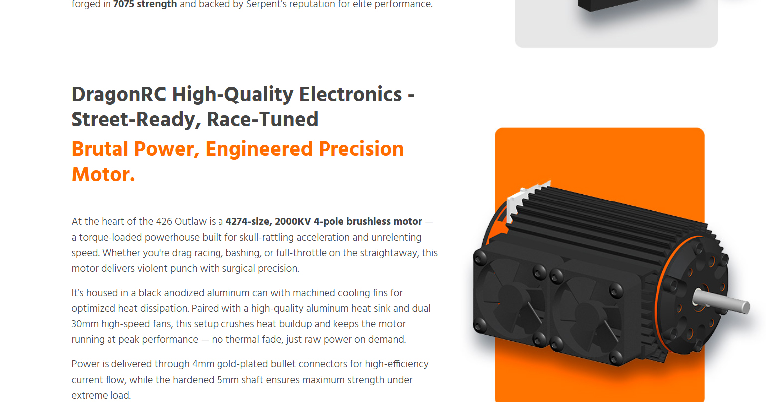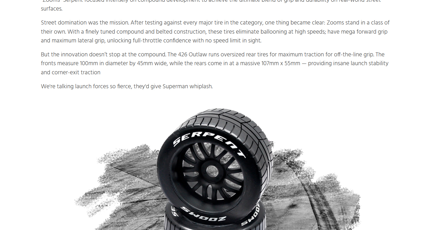 Born from Serpent’s precision racing heritage and forged for asphalt warfare, the 426 Outlaw is a street-shredding machine built to dominate with 6S brushless power, wide-body muscle, and pure outlaw attitude. This beast doesn’t just run like a muscle car — it looks and screams like one too. Whether you’re bashing for fun or a die-hard street racer, ready to own the asphalt, the all-new 426 Outlaw is built to get the job done — hard and fast. Powered by serious 6S brushless muscle and wrapped in a 1/7 scale wide-body inspired by the legendary machines of the golden era, the Outlaw brings raw ’60s aggression and race-proven performance all wrapped into one fierce package for the modern day RC street racing scene. From heart-stopping-launches that shake the pavement to high-speed drag runs, the 426 Outlaw tears through the streets with flared fenders, massive rear wing, supercharger, and a street-splitting stance that demands respect. Whether you’re tearing up your local parking lot or pushing the limits in a street race, this machine is your ticket to total domination. With Serpent’s racing heritage under the hood and outlaw attitude on every corner, the 426 Outlaw isn’t just another RC car — it’s a full-scale rebellion that challenges the status quo and leaves competitors in the dust. When the streets demand a rebel, the 426 Outlaw answers the call: no rules, no mercy.