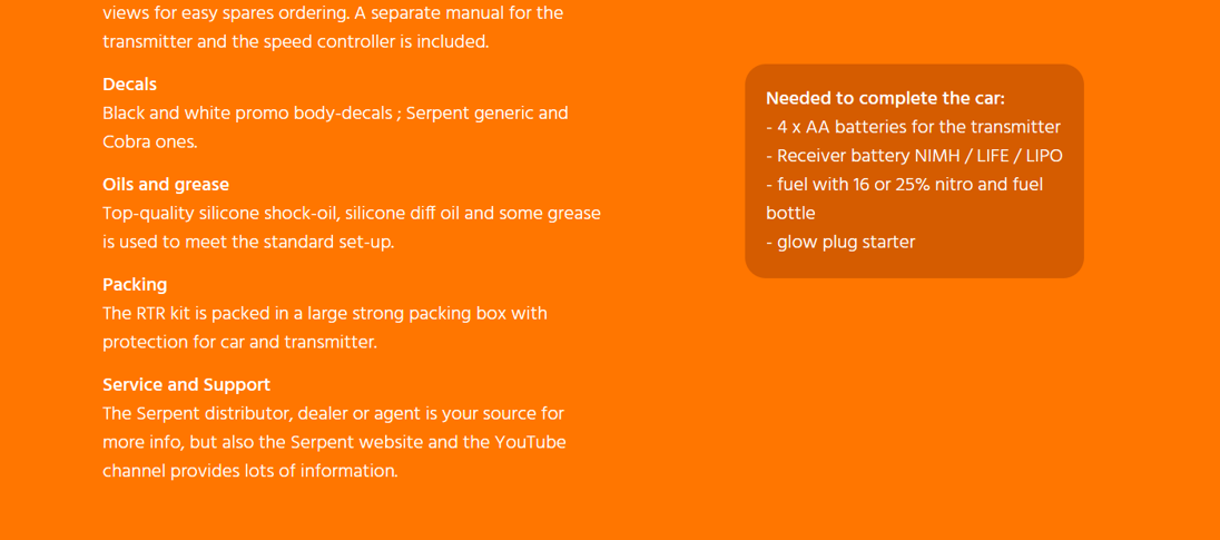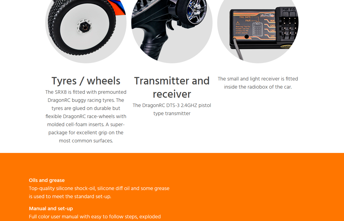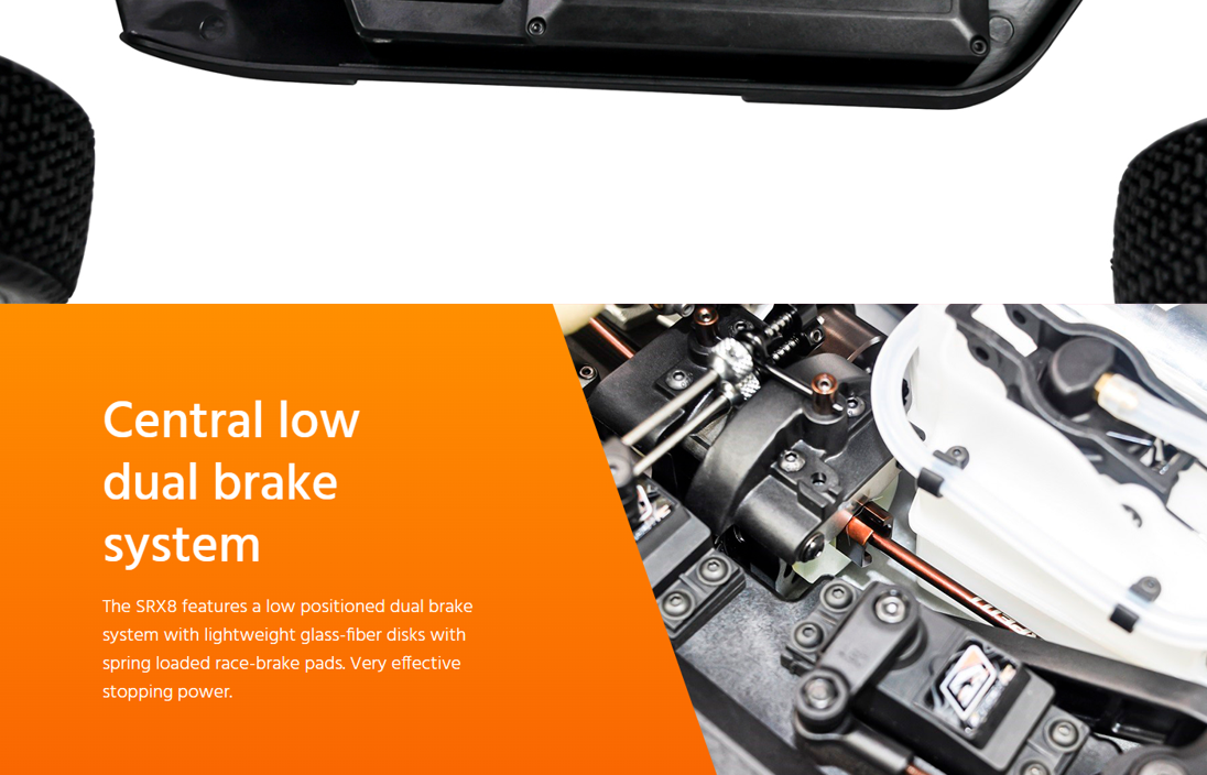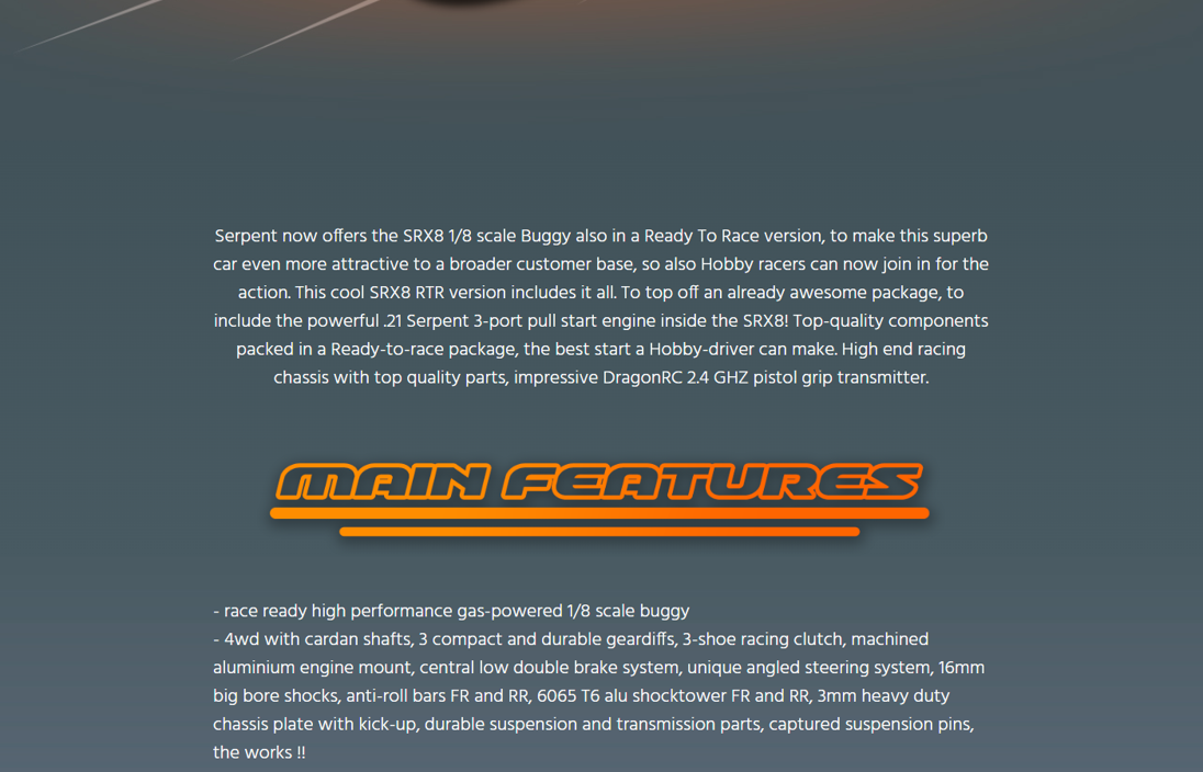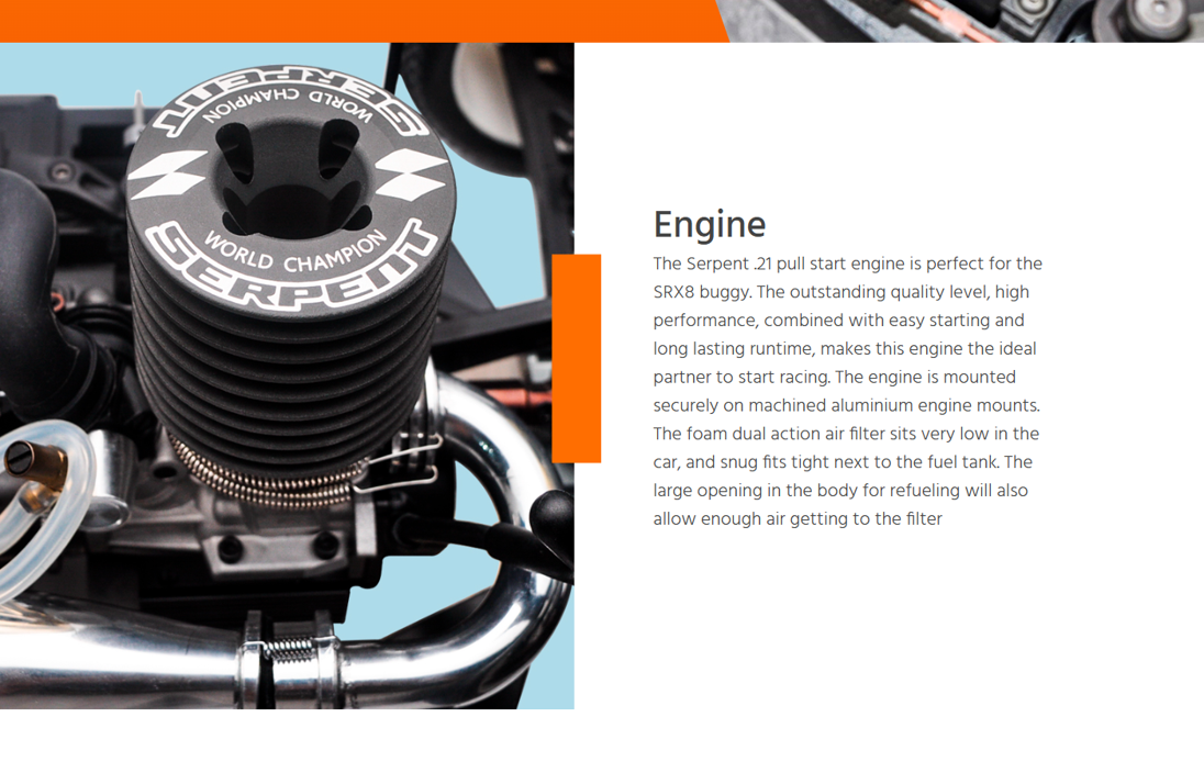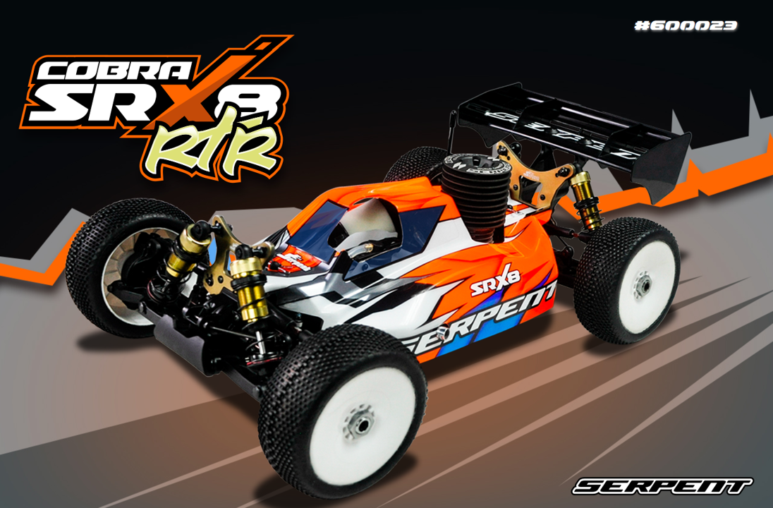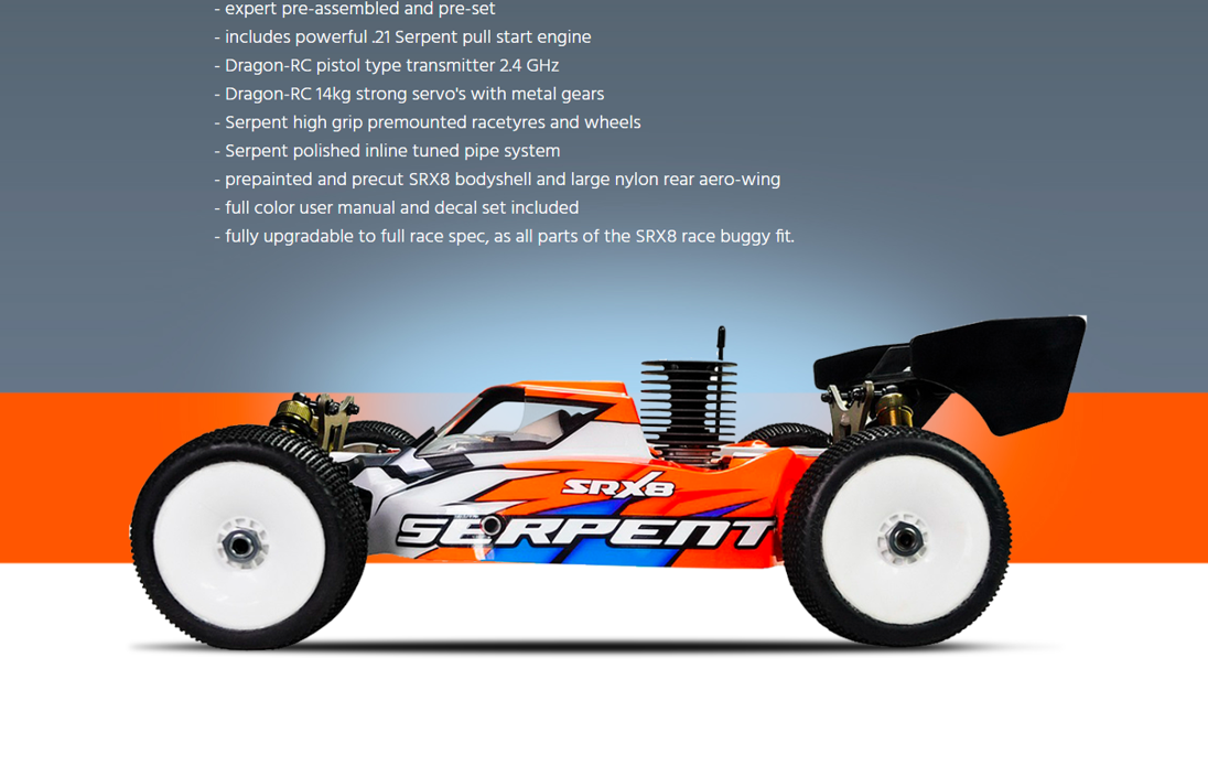 Serpent now offers the SRX8 1/8 scale Buggy also in a Ready To Race version, to make this superb car even more attractive to a broader customer base, so also Hobby racers can now join in for the action. This cool SRX8 RTR version includes it all. To top off an already awesome package, to include the powerful .21 Serpent 3-port pull start engine inside the SRX8! Top-quality components packed in a Ready-to-race package, the best start a Hobby-driver can make. High end racing chassis with top quality parts, impressive DragonRC 2.4 GHZ pistol grip transmitter.