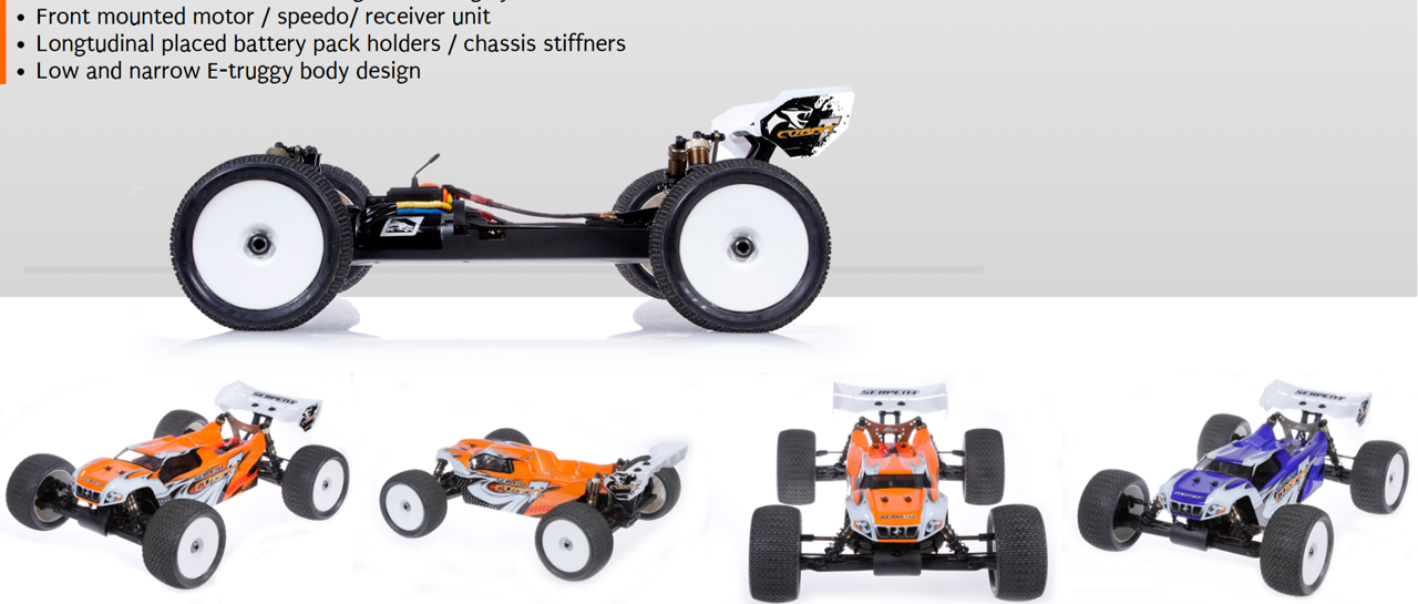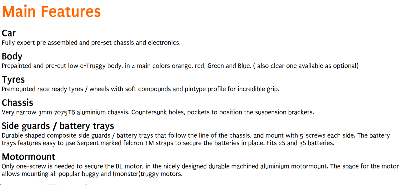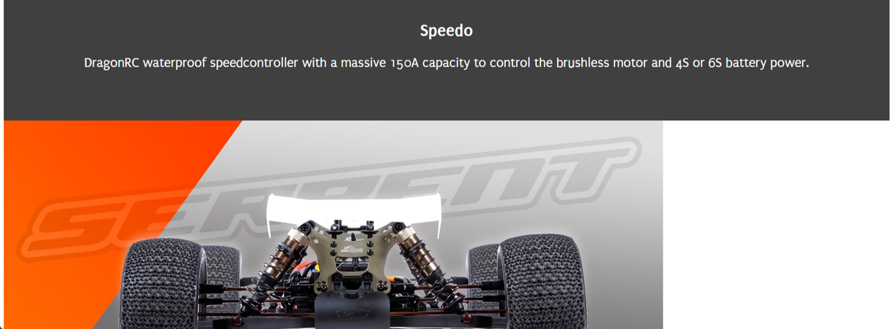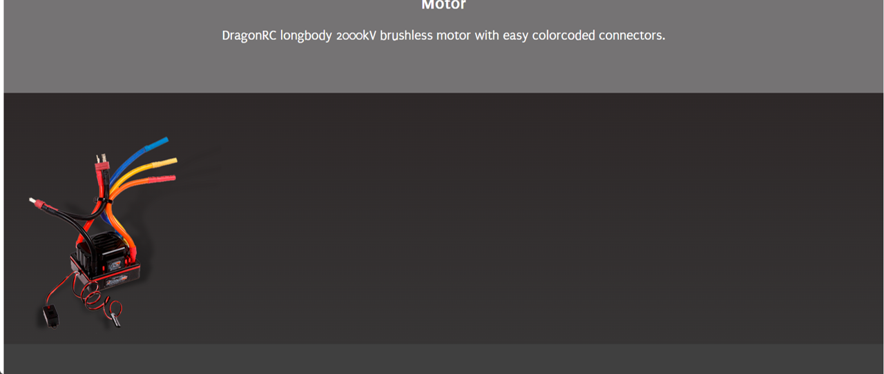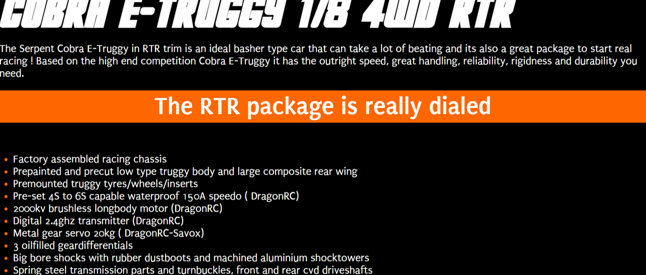 Factory assembled and pre-set 1/8 scale RTR E-Truggy with prepainted body and large rear wing, premounted truggy tyres, waterproof 150A speedo (4S), 2000 kv brushless motor, 16kg metal-gear DragonRC-Savox servo, 2.4 GHz transmitter, aluminium chassisplate, big bore shocks, anti-roll bars, 3 geardiffs.
