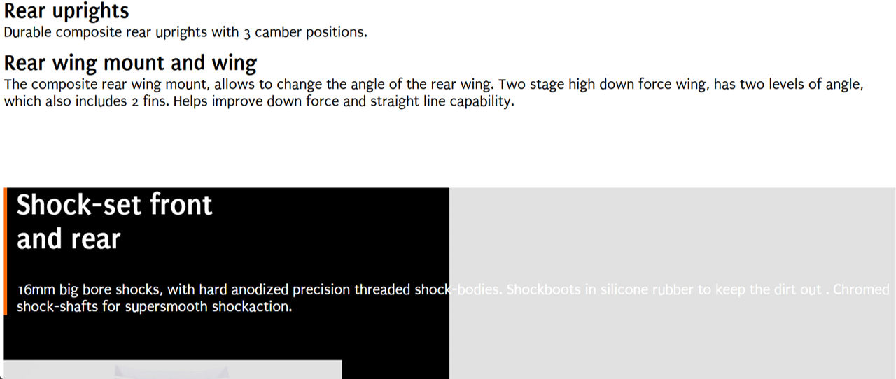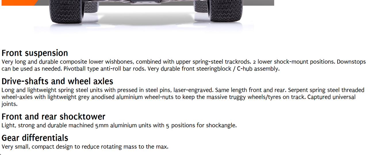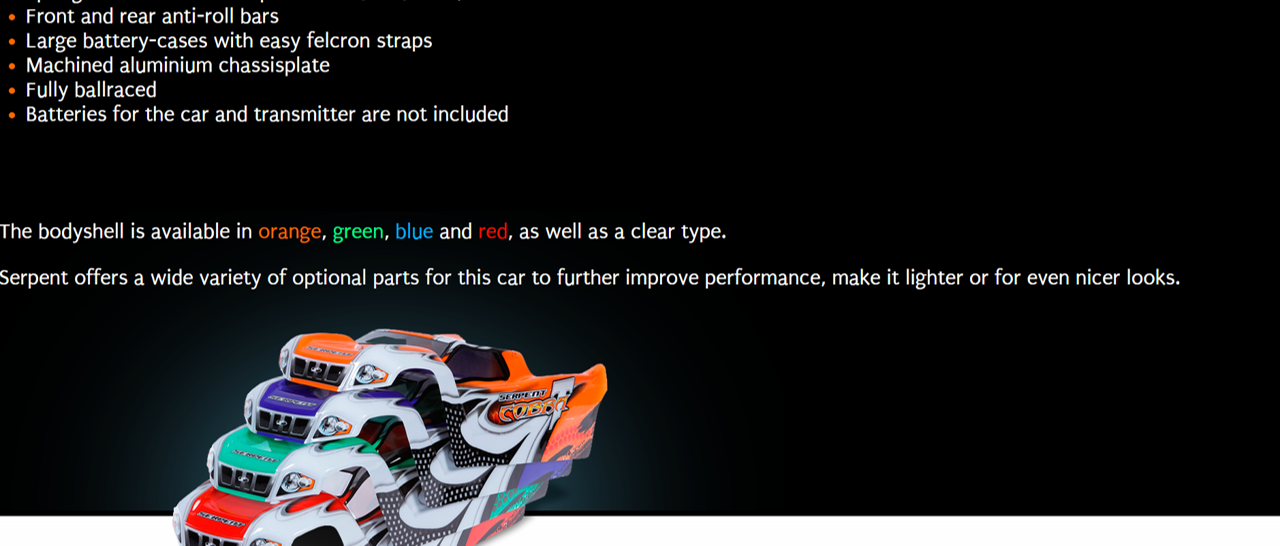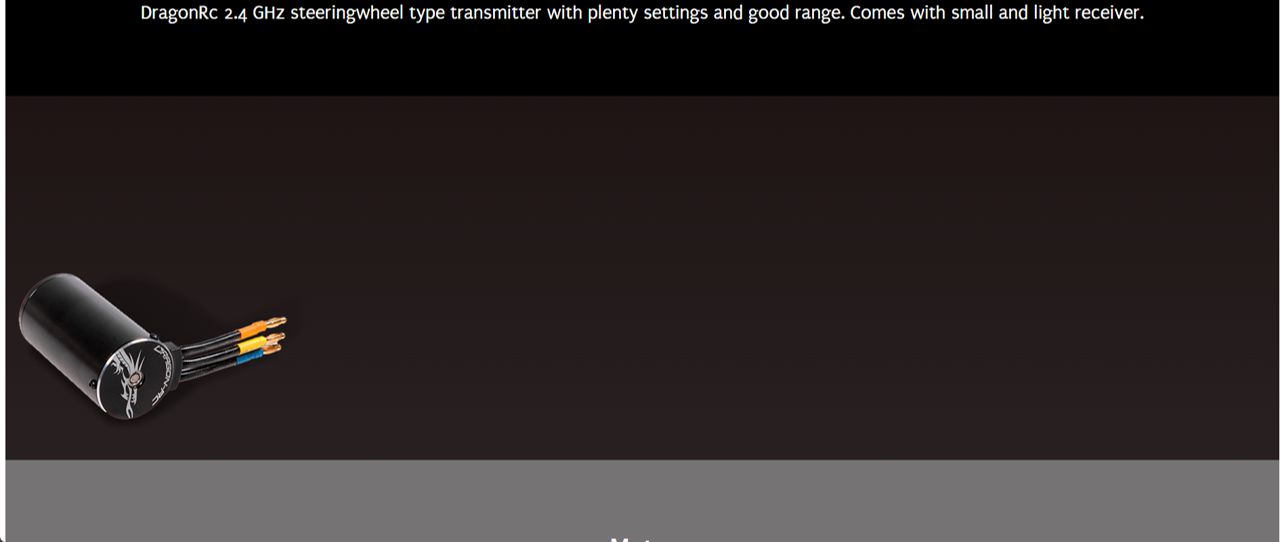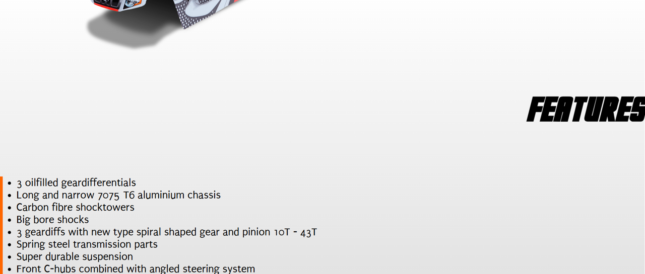 Factory assembled and pre-set 1/8 scale RTR E-Truggy with prepainted body and large rear wing, premounted truggy tyres, waterproof 150A speedo (4S), 2000 kv brushless motor, 16kg metal-gear DragonRC-Savox servo, 2.4 GHz transmitter, aluminium chassisplate, big bore shocks, anti-roll bars, 3 geardiffs.